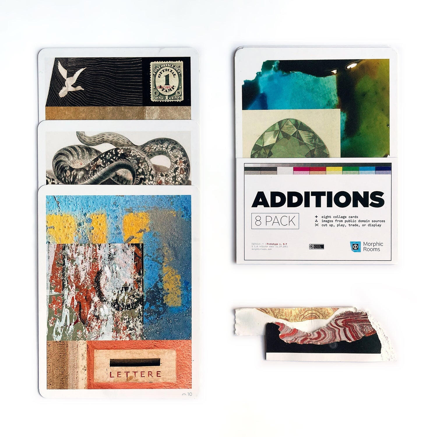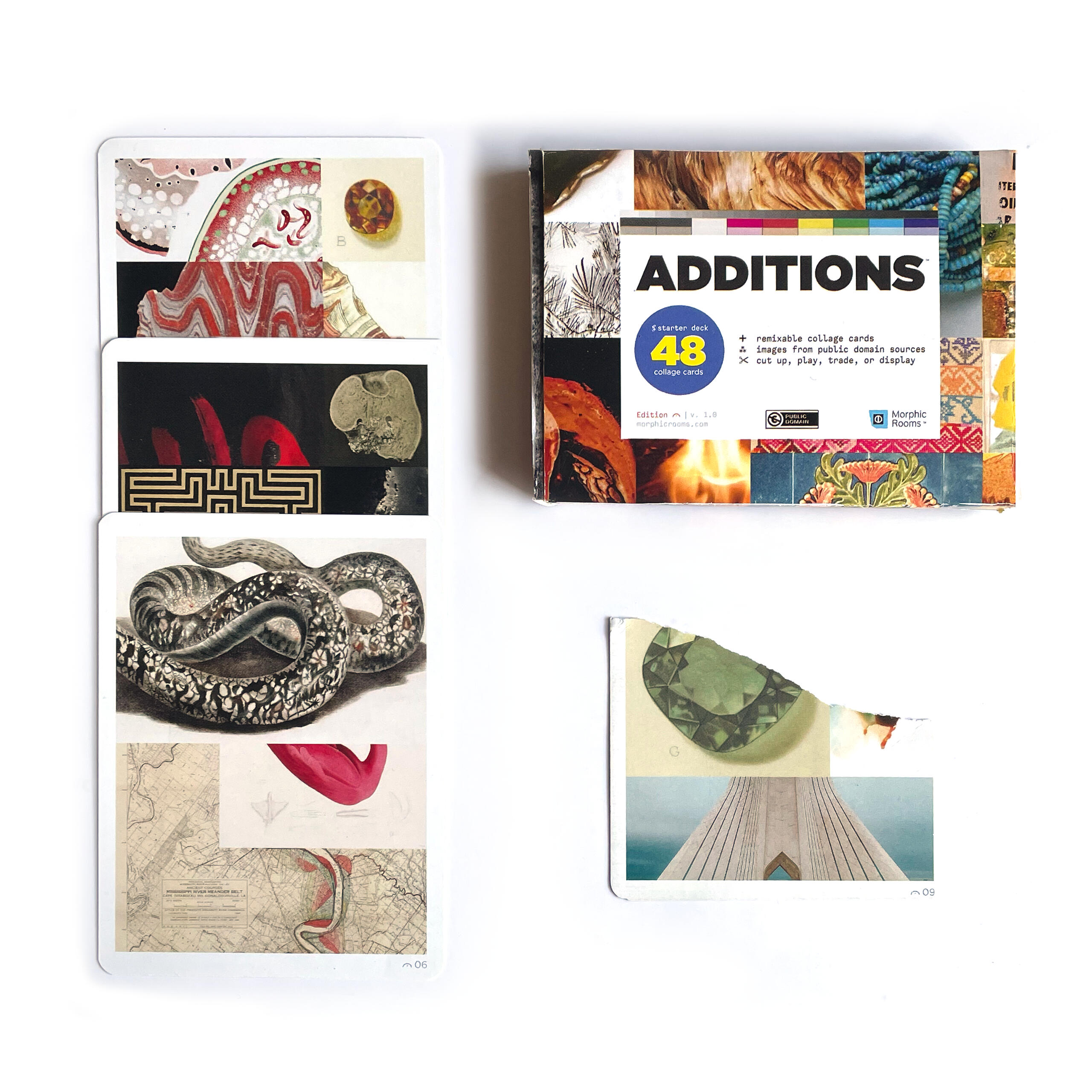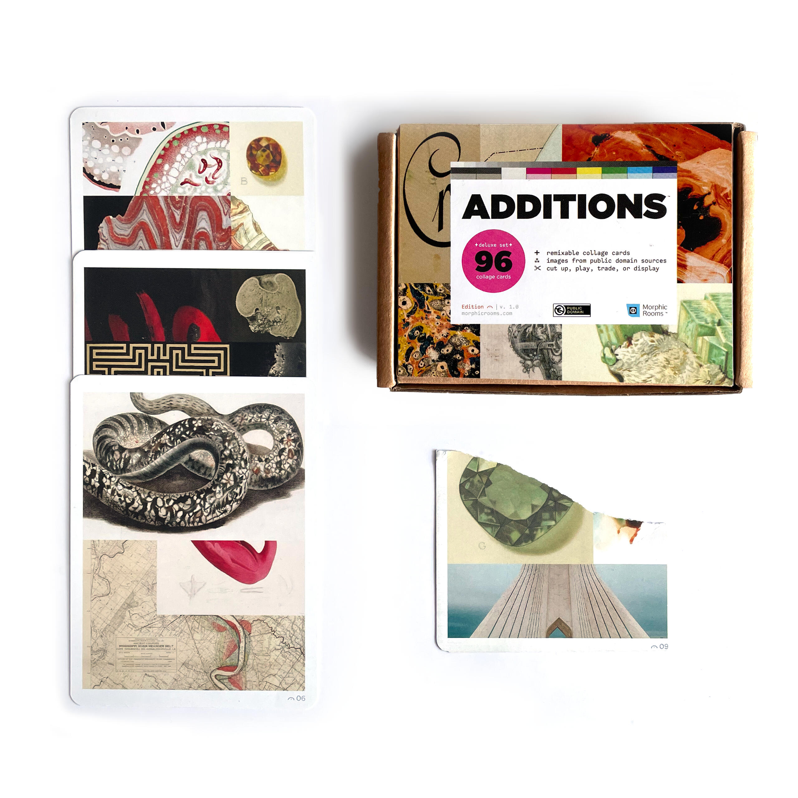 We are seeking collages that make creative reuse of the cards in the ADDITIONS deck. Work received will be considered for inclusion in EDITIONS, a full-color zine to be released in the summer of 2022.Submissions are open January 15-March 30, 2022.We accept submissions of up to ten collages at a time.To be eligible, each piece you submit must use imagery taken from at least one card from the ADDITIONS deck of “collage cards.” (A variety of card sets are available at shop.morphicrooms.com, and a digital edition is available at morphicrooms.itch.io for $5.) You do not need to limit yourself to using only ADDITIONS cards–we designed them to “play well with others,” so you may combine them with a variety of other source material. Use of mixed media, similarly, is fine, as long as you would still describe the completed work as a “collage.” Free theme and size, but note that the final zine will be printed in a portrait (vertical) format.Send your completed pieces to morphicrooms@gmail.com. Please use [your last name]-EDITIONS submission as a subject line. Include a short bio, including links to your social media information, if applicable.Please send your work as .png, .tiff, .jpg, or .pdf files, and be sure that the file is 300dpi or higher. A high resolution is necessary to ensure that your work looks great in print! We can accept Google Drive links if your files are large. Title each individual file [your last name]-EDITIONS-[title of piece].We don't accept pieces previously published in a zine, journal or magazine, either in physical form or online–though pieces which have been previously shared on social media are fine. We ask for first print publication rights on the work(s) we accept, and the rights to share the work(s) on social media platforms non-exclusively, with artist credit, in conjunction with this project. All other rights revert back to you upon publication, though we hope you will credit Nonmachinable as first publisher should your piece(s) be published elsewhere in the future. You will retain ownership and copyright of your work.We can decline work for any reason, and we will automatically decline work that strikes us as sexist, racist, ableist, homophobic, or transphobic, or that otherwise violates our license governing the use of the ADDITIONS cards (available here). We do not provide feedback on declined work.We accept simultaneous submissions, but please contact us to withdraw pieces if they are accepted by another publication.We hope to provide a response before April 30, 2022. Feel free to send us a query if you haven't heard back from us by then.Contributors selected for publication will receive one copy of the zine at no cost, and additional copies will be available at a discount.